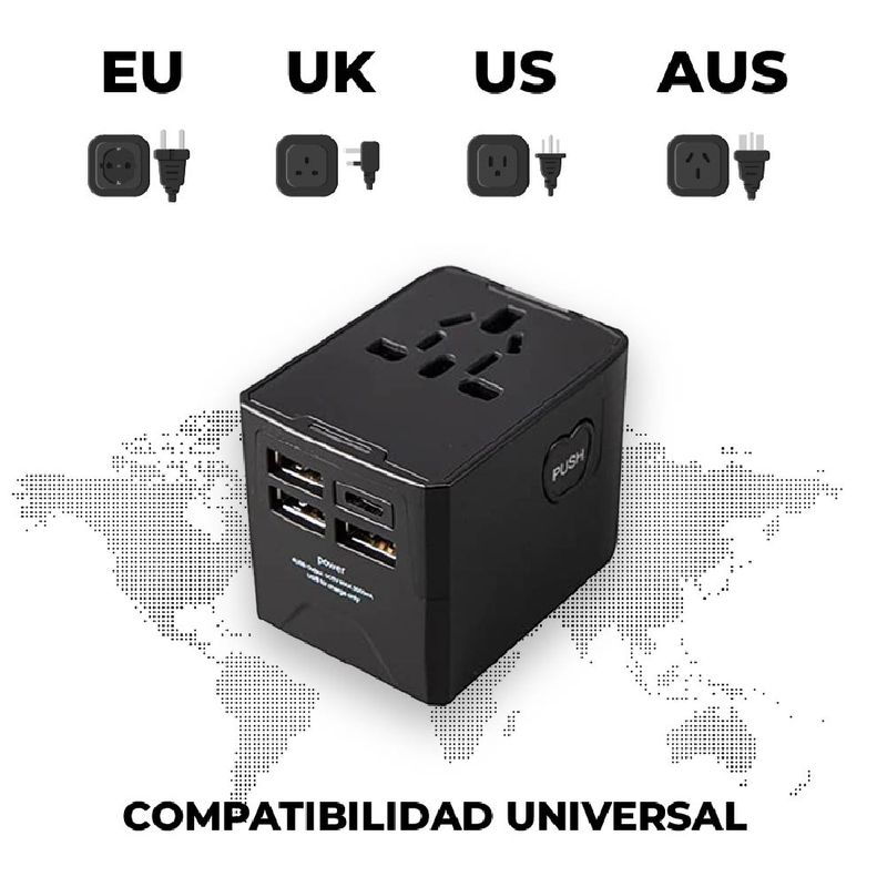 Adaptador de viaje internacional: enchufe 4 USB (1 TipoC) + funda