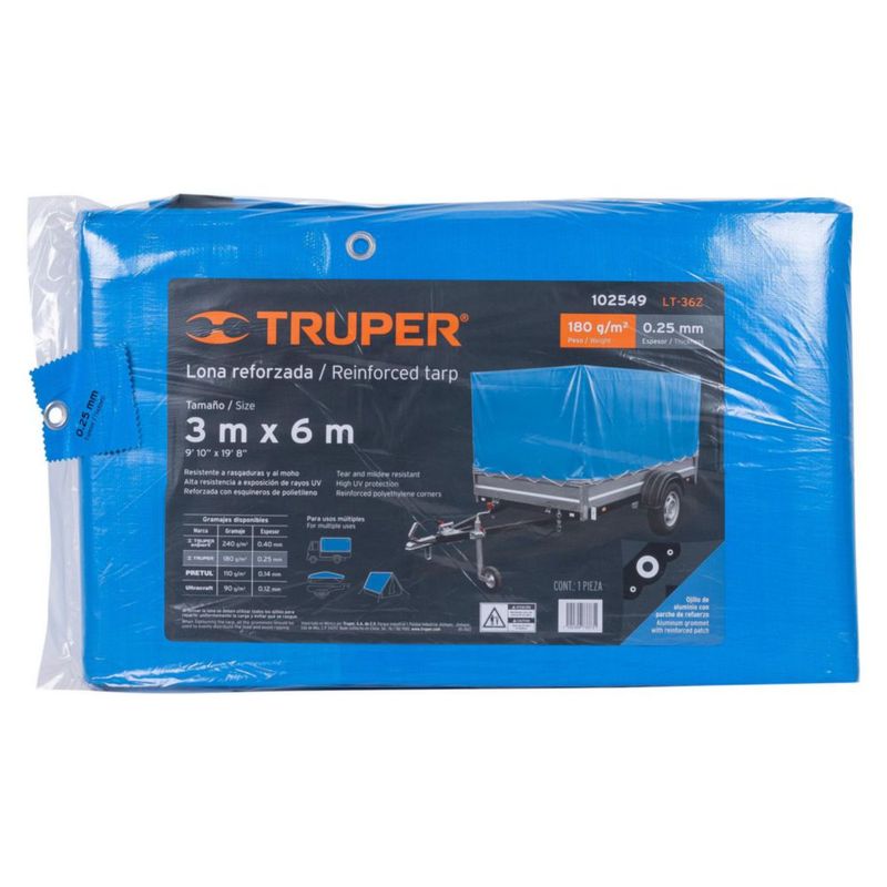 AM3K ofrece lona de polietileno reforzada TRUPER LT-36Z, azul, 3x6 m, 180 g/m², fuerte, impermeable y resistente para trabajos pesados.