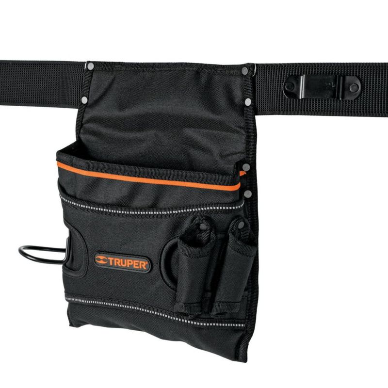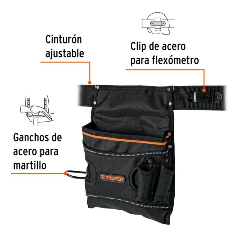 AM3K ofrece porta herramientas de poliéster 600 deniers, 5 compartimentos, con cinturón ajustable y ganchos de acero: durabilidad profesional.
