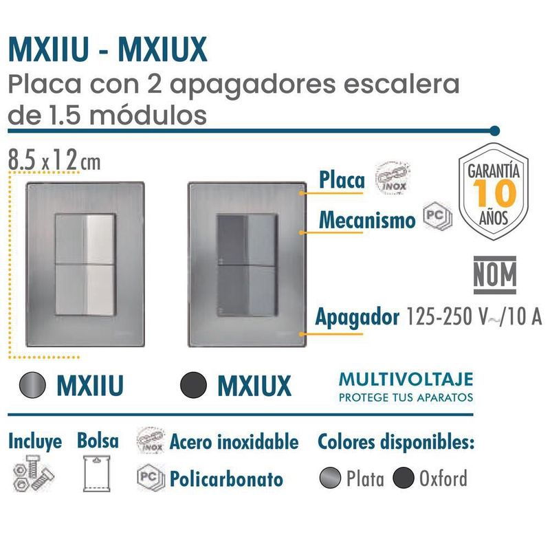 Apagador Escalera Alta Calidad MXIIU-006 Inoxium2ESilver Placa con Dos Apagadores Escalera