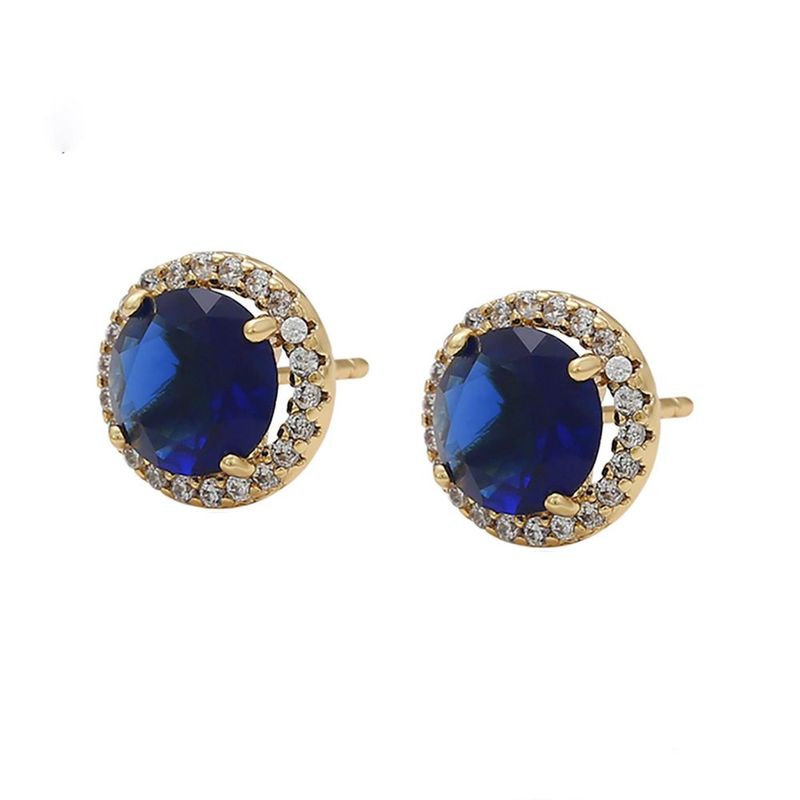Aretes Broquel Zafiro Halo Cristales Dama Oro 14K Laminado Dorado