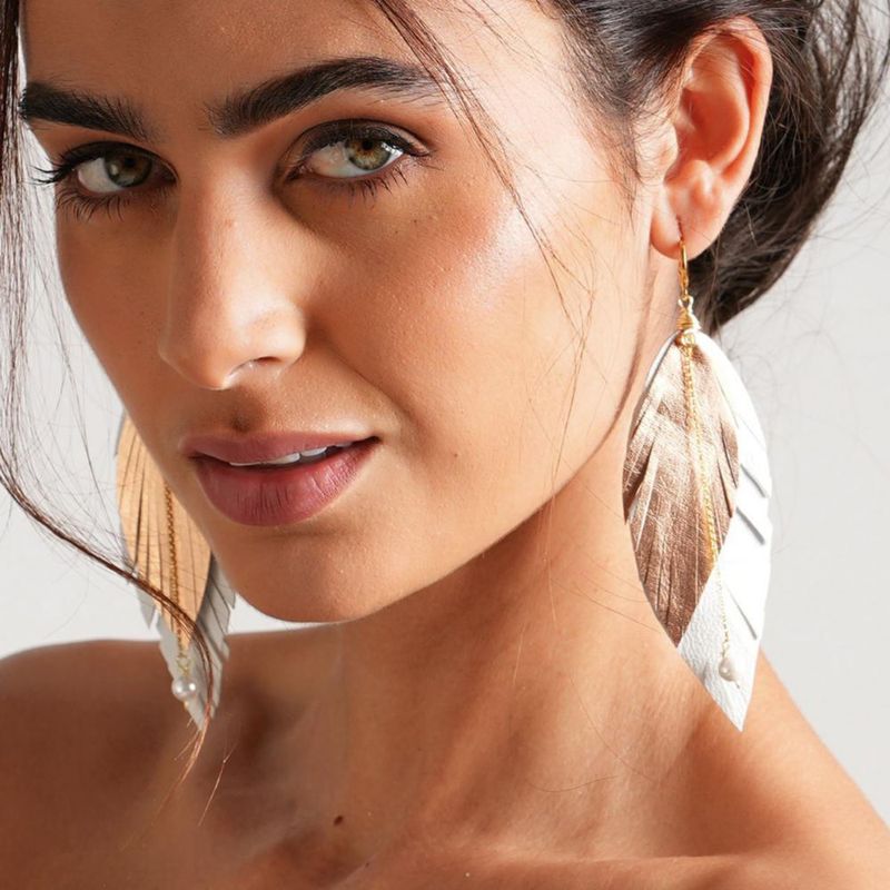 Moda y accesoriosJoyeríaAretesVangania aretes largos de pluma en cuero dorado con cadena y perla mayorca
