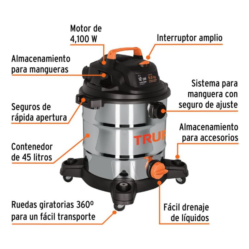 Línea blancaElectrodomésticosAspiradorasAspiradora de solidos y liquidos de 12 gal Truper ASP12X