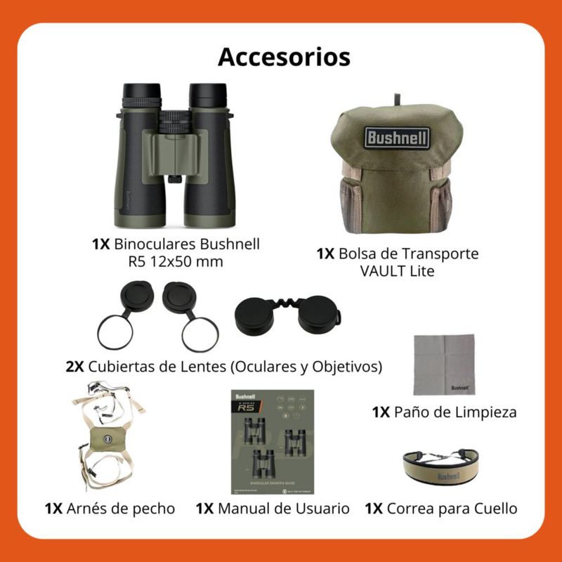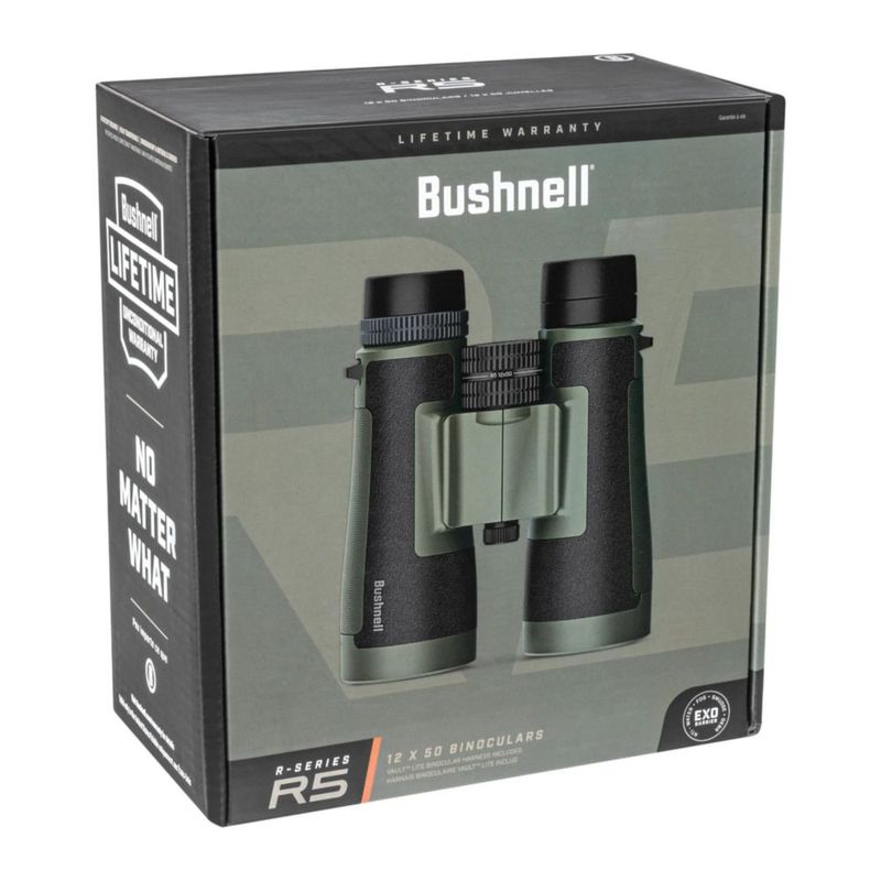 Binoculares Bushnell R5 12x50 Roof Exo Dielectric IPX7 Verde, resistentes al agua y niebla, con óptica multicapa y prismas BaK-4