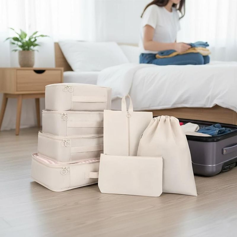 Bluelander Juego de 8 Bolsas de Viaje, Kit de Viaje Organizador Impermeable, para Ropa, Zapatos, Lavandería y Cosméticos, (Beige)