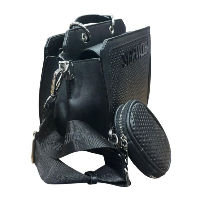 Bolsa Shoulder Bevelyn PERF Steve Madden color negro, mide 24 cm de ancho por 19 cm