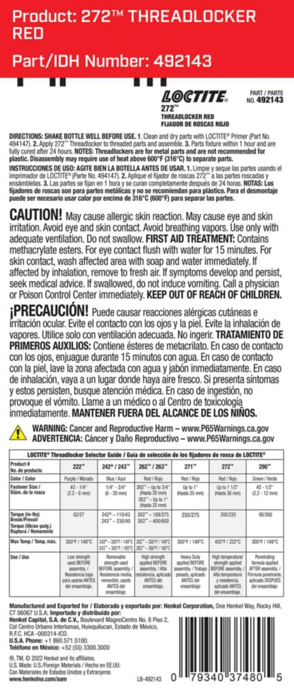 AutomotrizAutomotrizArtículos de LimpiezaBotella Threadlocker Loctite 272 de 36 ml de alta resistencia para automoción