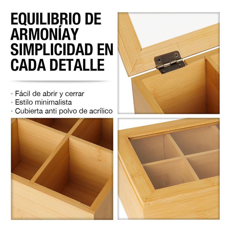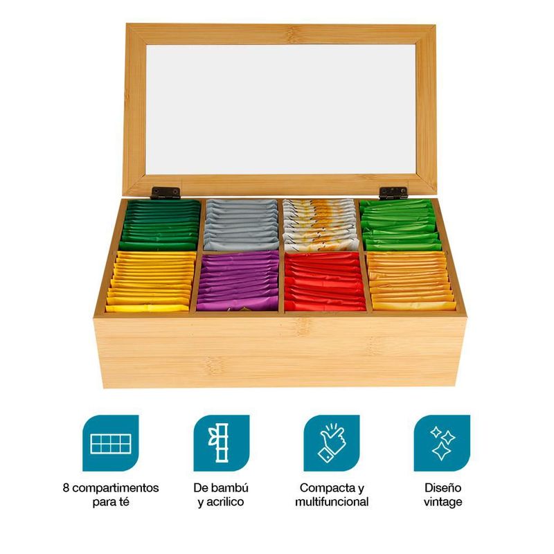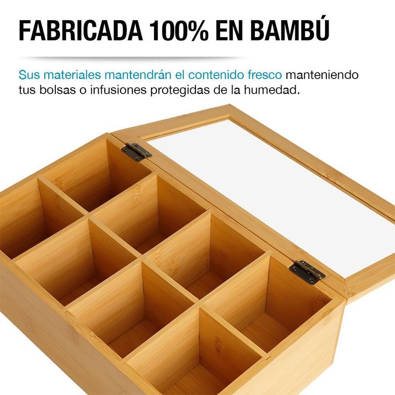 HogarCocinaOrganizadores de cocinaCaja Organizadora para Té 100% Madera de Bambú 8 Compartimentos