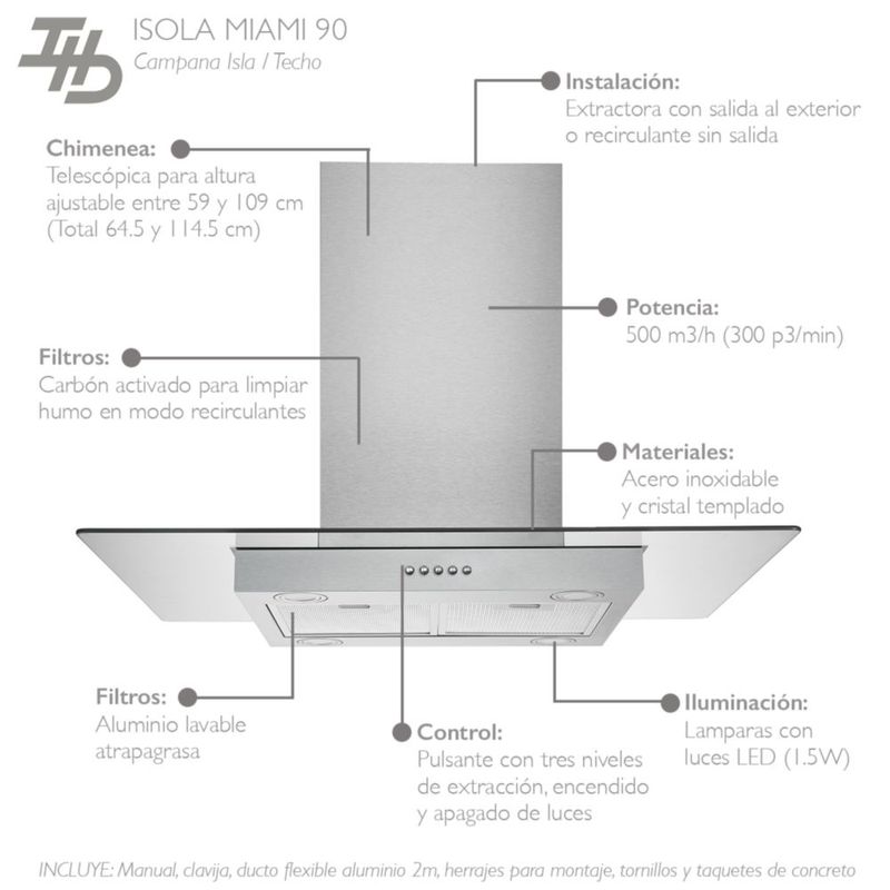Línea blancaCocinaCampanasCampana Cocina Decorativa Isla Isola Miami 90 cm Acero Inoxidable Cristal Plano Chimenea Telescopica