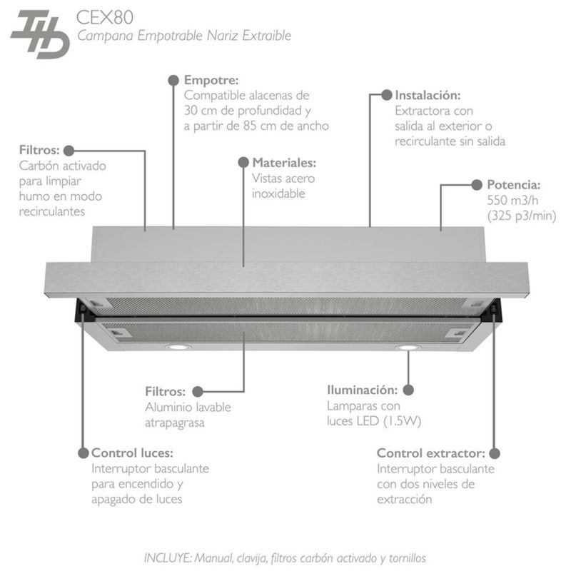 Línea blancaCocinaCampanasCampana Empotrable Extraíble IHD CEX80 de 80 cm en Acero Inoxidable