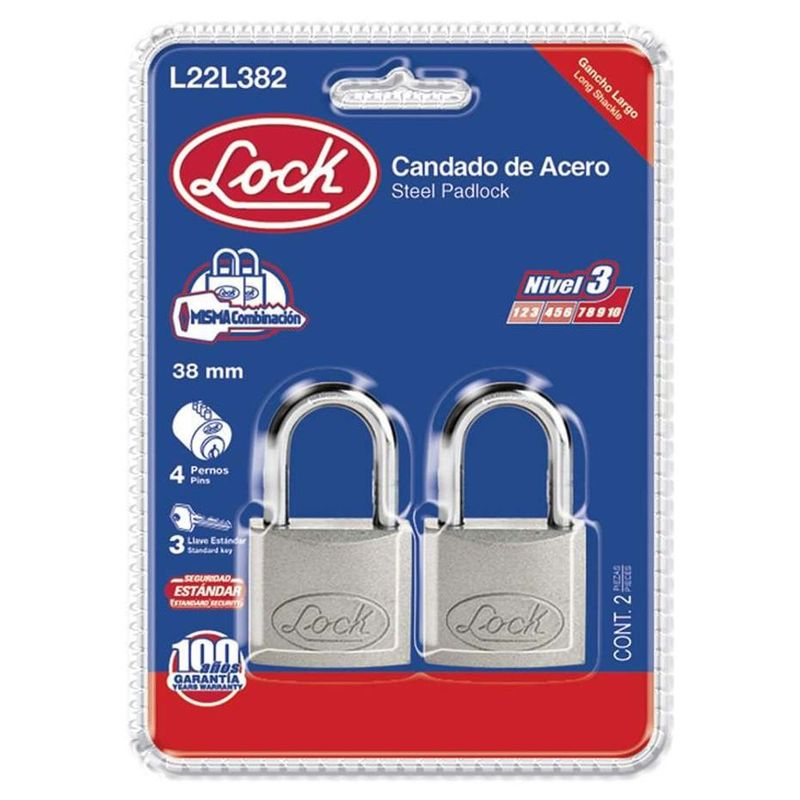 Candado Acero Largo Llave Estandar 2 Pzas Cromo Lock