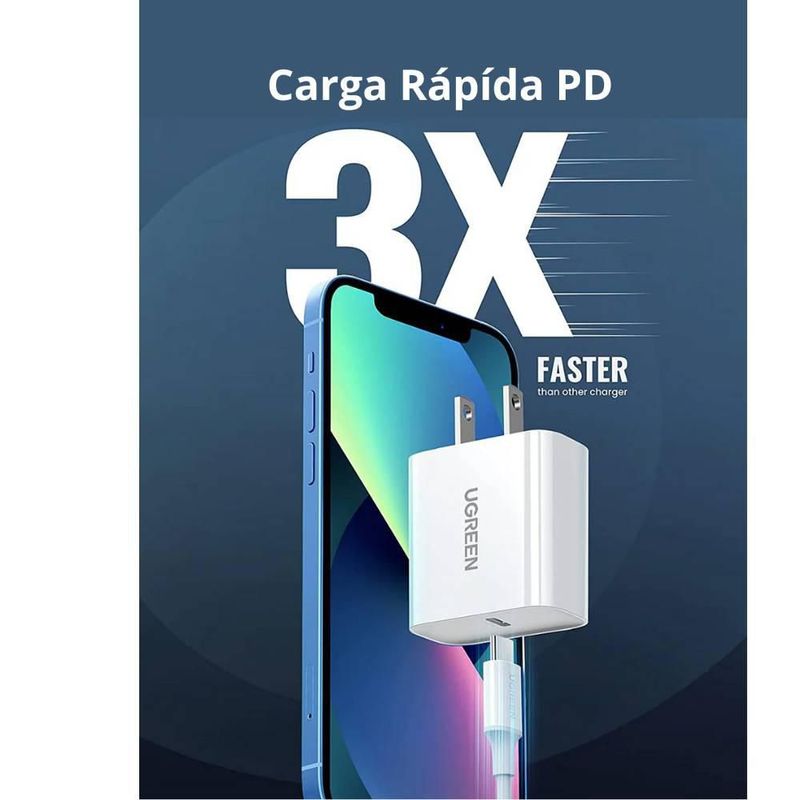 Cargador Tipo C de 20W Ugreen Carga Rápida color blanco