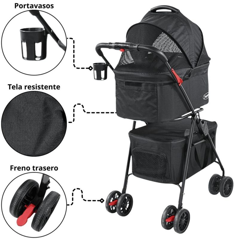 Carriola Doble para Mascotas Cochecito para Perros y Gatos Pequeños - Medianos Transportadora Ligera y Plegable Ruedas con Freno Negro
