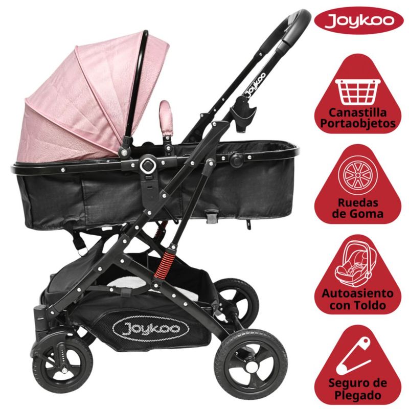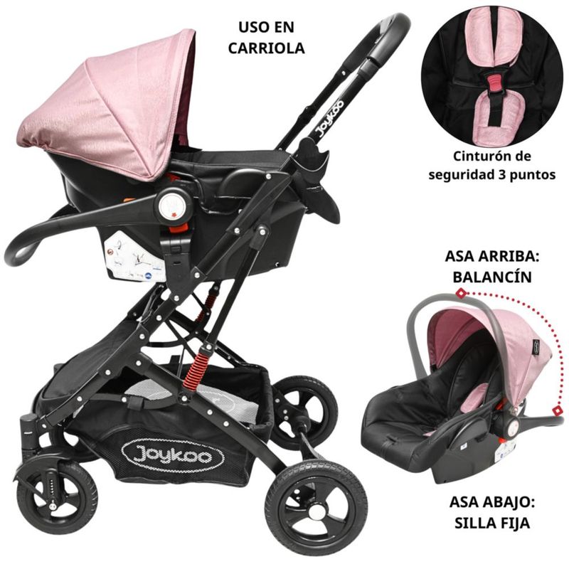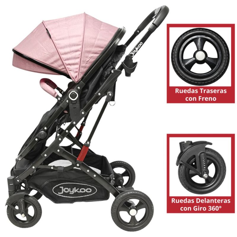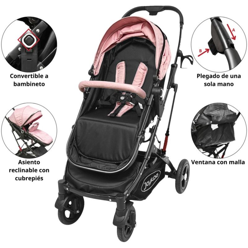 Carriola para Bebé con Portabebé Reversible Convertible a Bambineto Ruedas de Goma con Freno Plegable Cinturón de 5 Puntos - Rosa
