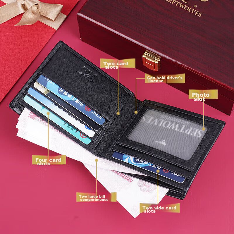 Cartera SEPTWOLVES de Cuero Real Negra para Hombre con Porta Tarjetas