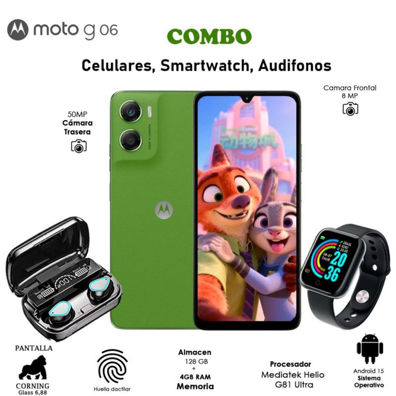 Celular Moto G06 128GB 4GB RAM Dual Sim Verde con Audifonos,Smartwatch Bluetooth