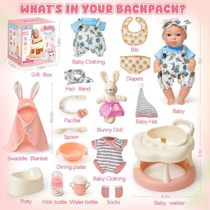 Cleboen - Juego de accesorios para muñecas de 23 cm para niñas, incluye 2 juegos de ropa, andador, biberón, chupete, pañal y man