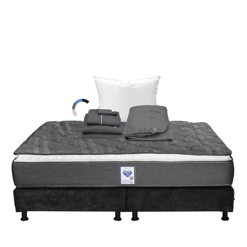 Colchón King Size Spring Air Aries + Box Gris Carbón + Almohada Royal + Protector Lux + Juego de Sábanas Royal Gris Oxford RGH