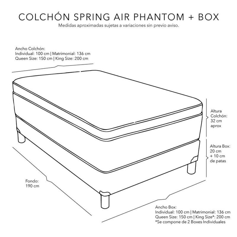Colchón Matrimonial Phantom + Box + Almohadas 2Pack+ Sábanas Softy CZD