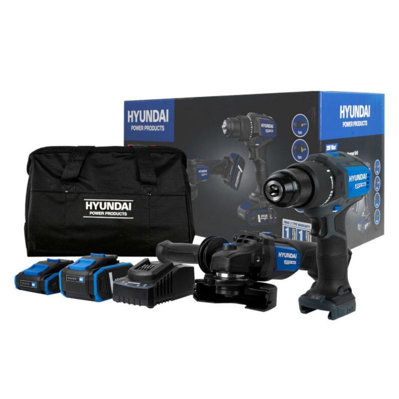 HerramientasEléctricasRotomartillos, Taladros y DestornilladoresCombo Brushless Taladro De Impacto 1/2″ Y Esmeriladora Angular Hyundai 20v Li-Ion C/Accesorios – S02-FTB