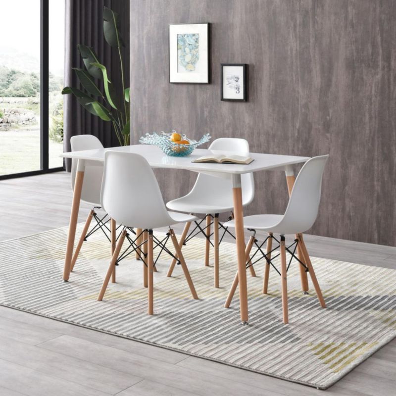 Comedor Completo Blanco con 4 Sillas con Patas de Madera y Soporte Metálico