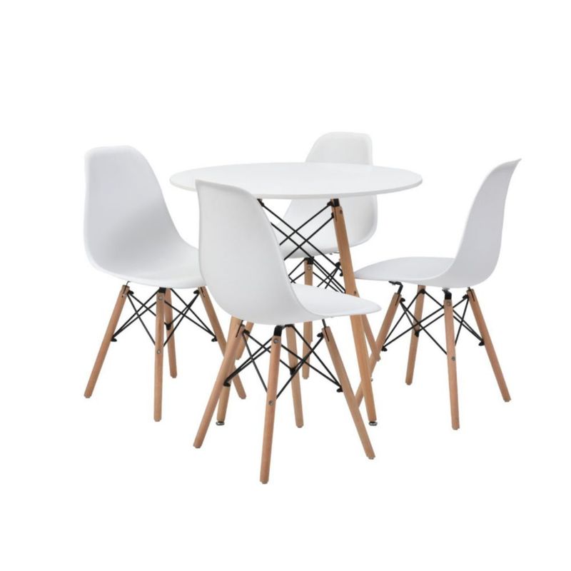 HogarPatio y JardínComedores y MesasComedor Completo Blanco con Mesa Redonda y 4 Sillas con Patas de Madera y Soporte Metálico