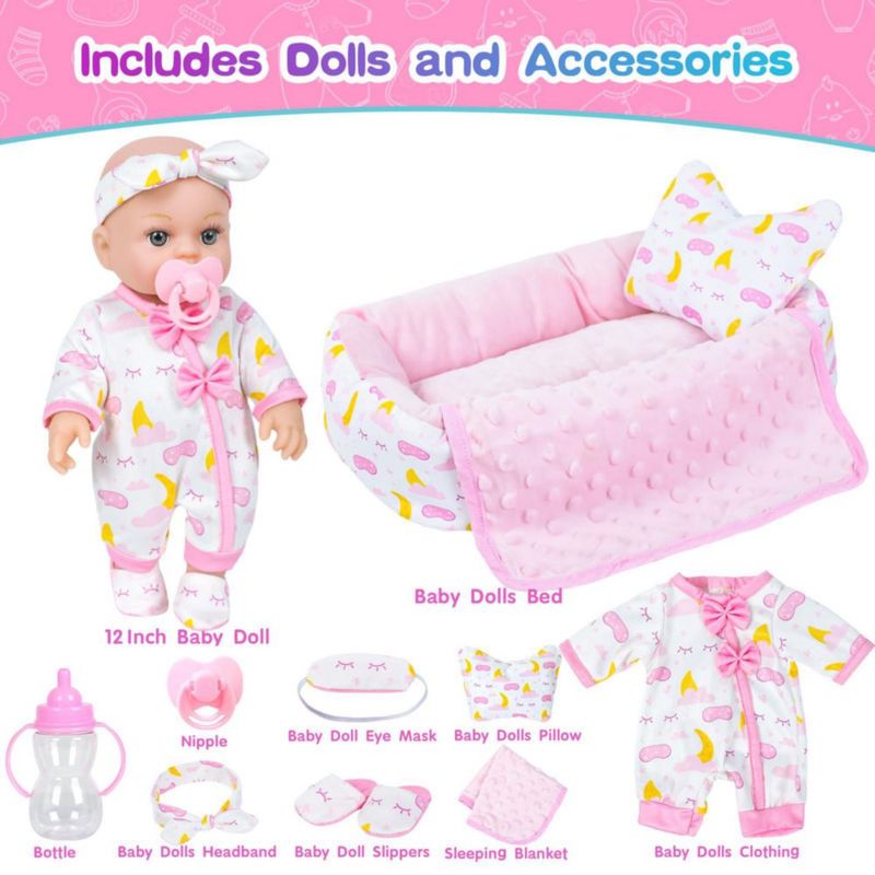 Cuna de 12 pulgadas para muñecas con ropa y accesorios. Incluye cuna suave para dormir, biberones, tetina, antifaz, pantuflas, m