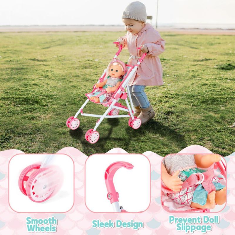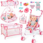 deAO - Cochecito de bebé para muñecas, cuna, cama, juego de rol, accesorios para muñecas, tapete de juego, cuna de viaje, cochec