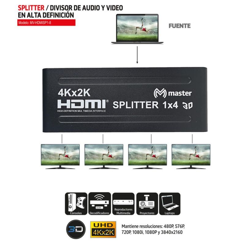 CómputoAccesorios y periféricosCables y AdaptadoresDivisor Splitter De Audio Y Video 1 Entrada 4 Salidas MV-HDMISP1-4