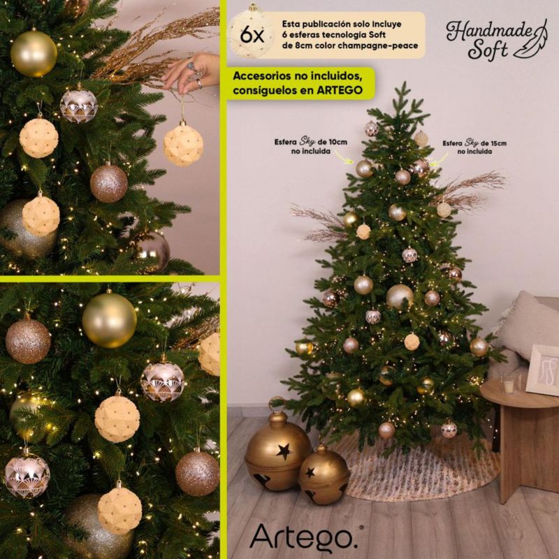 Esferas para árbol de navidad Artego de 8 cm de diámetro paquete 6 esferas Champagne Peace Línea Handmade Acabado soft con 3 estilos diversos