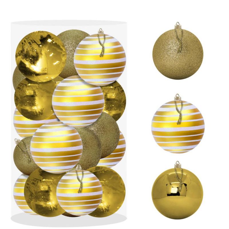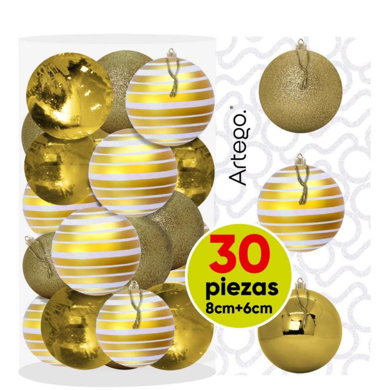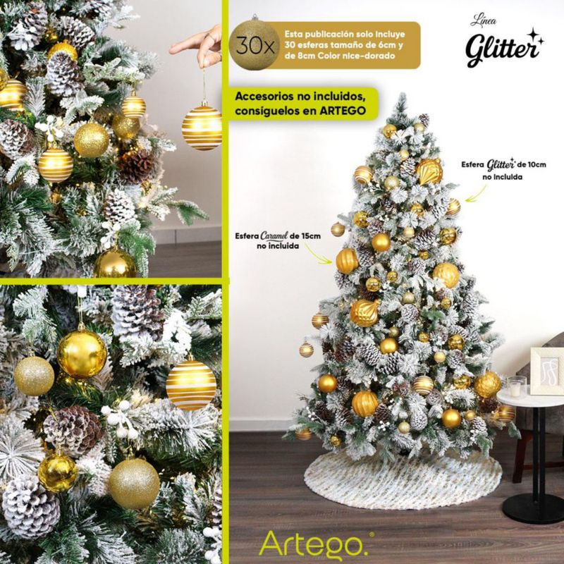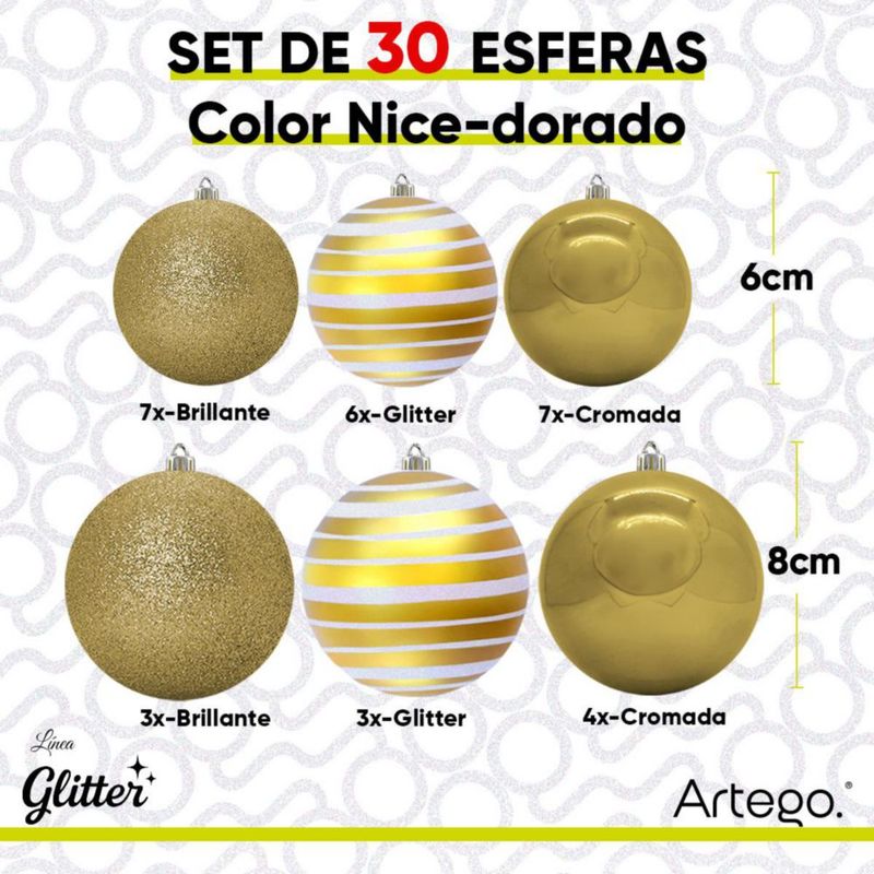 Esferas para árbol de navidad Artego set mix de 30 esferas: 10pz*8cm 20pz*6cm color Dorado NICE Línea Glitter