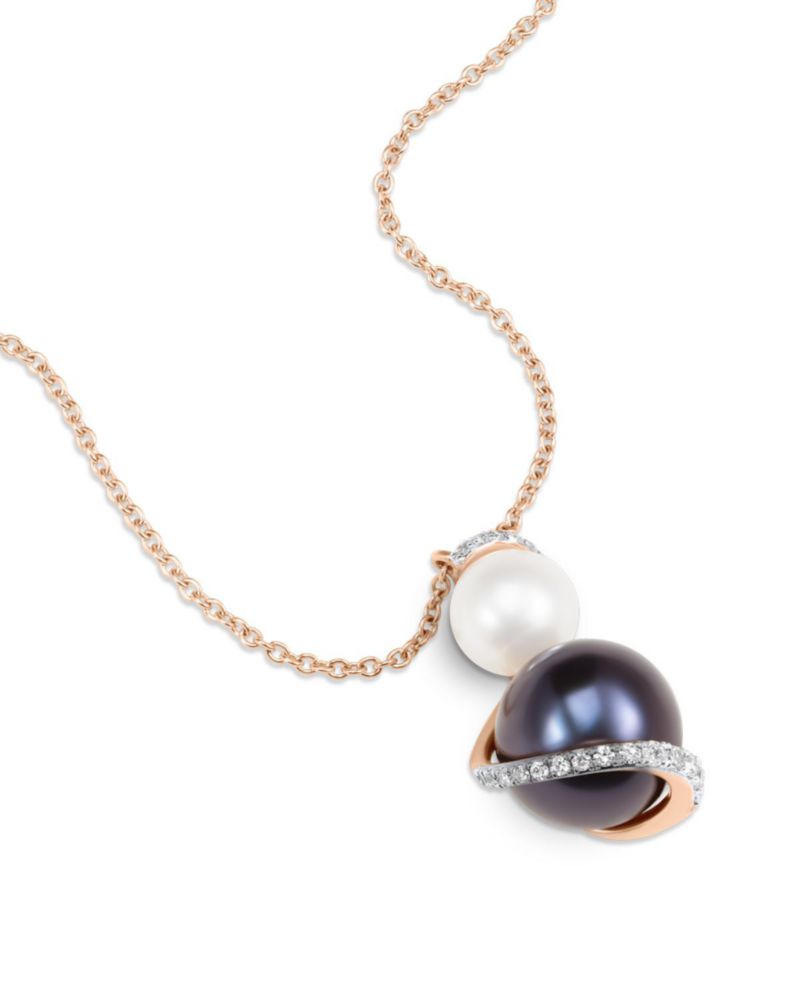 GARGANTILLA DE ORO ROSA 14K CON 6PTS DE DIAMANTE Y PERLA BLANCA Y NEGRA