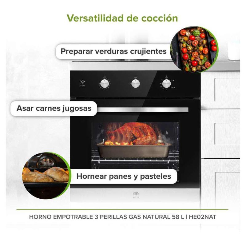 Línea blancaCocinaHornosHorno de Gas Natural 58 L Empotrable Acero Inoxidable AVERA HE02NAT
