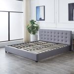 Colchones y BoxesBoxesMatrimonialIlios Innova | Base de Cama Matrimonial de Madera con Cabecera Tapizada en Lino Gris. Moderna y Elegante para Renovar tu Recámara.