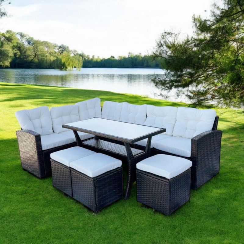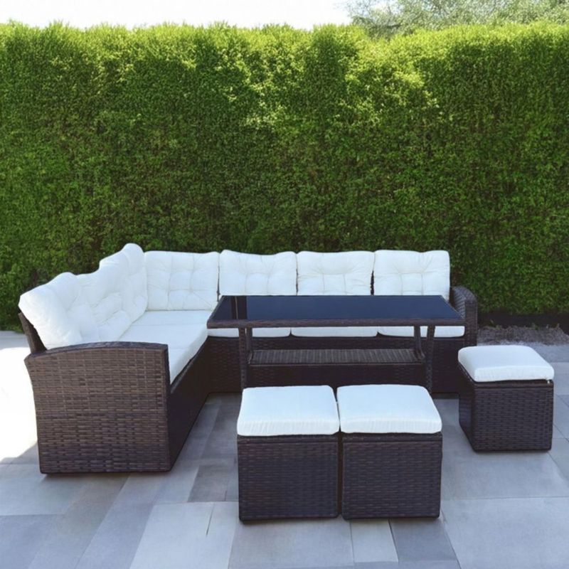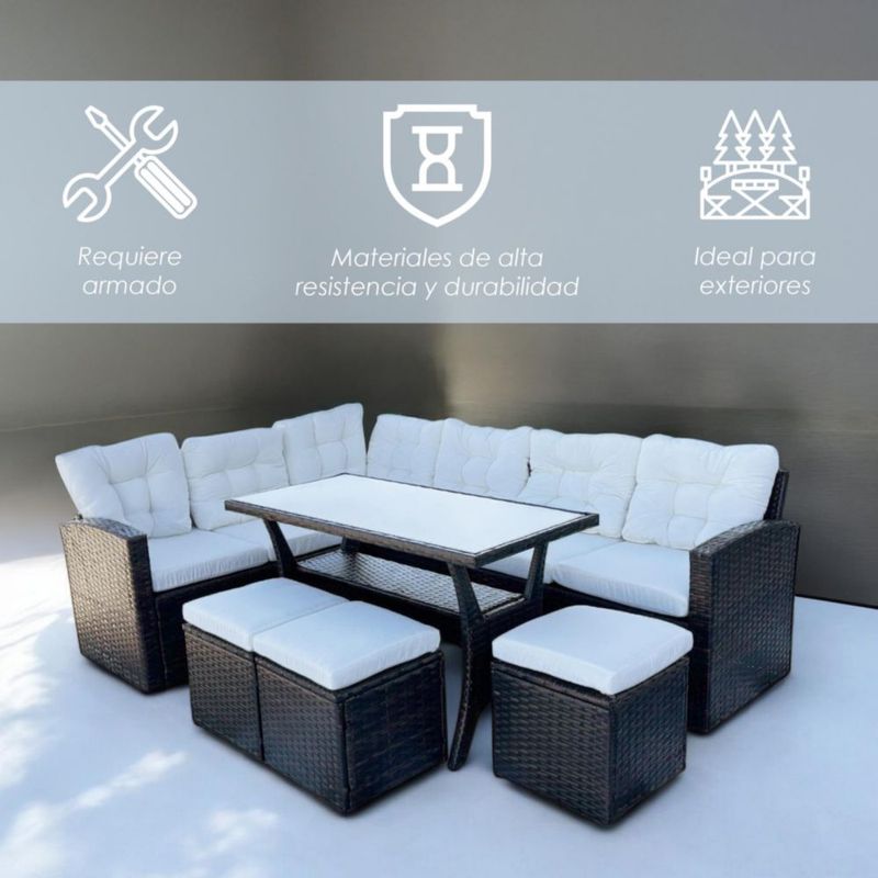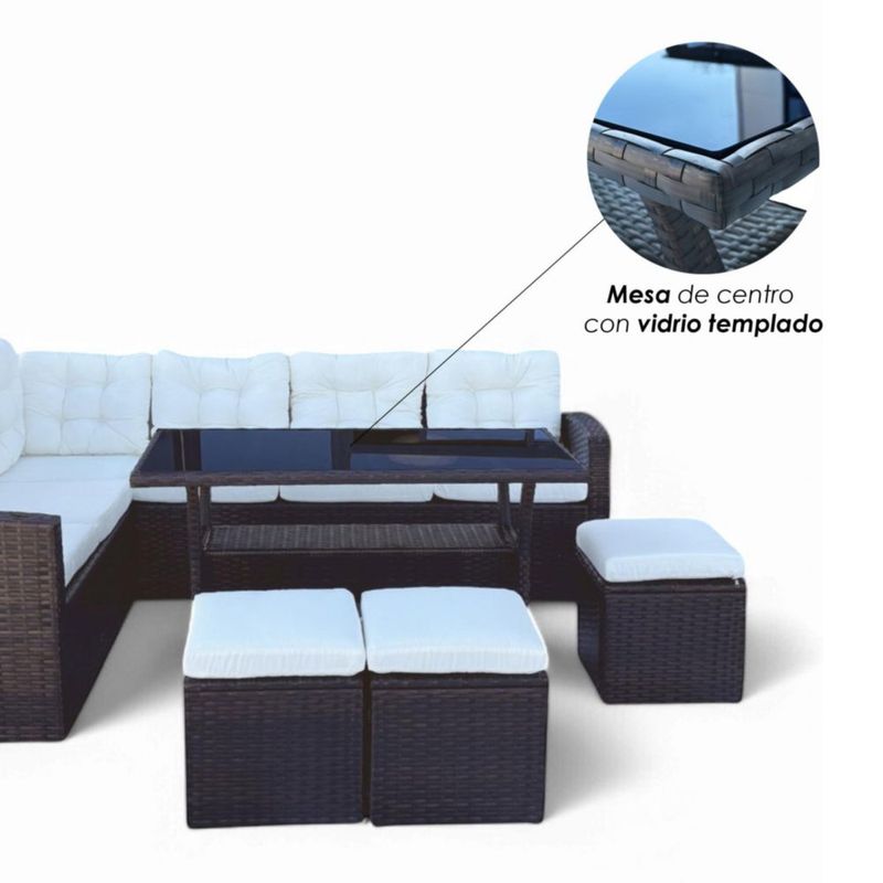 HogarPatio y JardínSillas, Sillones, Bancos y SofásIlios Innova | Juego de Sala para jardín esquinera 6 Piezas Mesa de Centro de Cristal Templado Sofás de Mimbre sintético acojinados