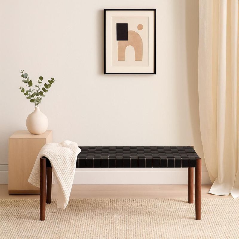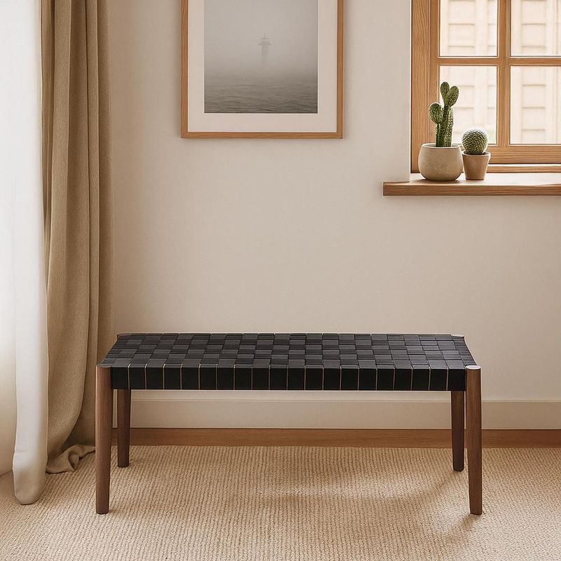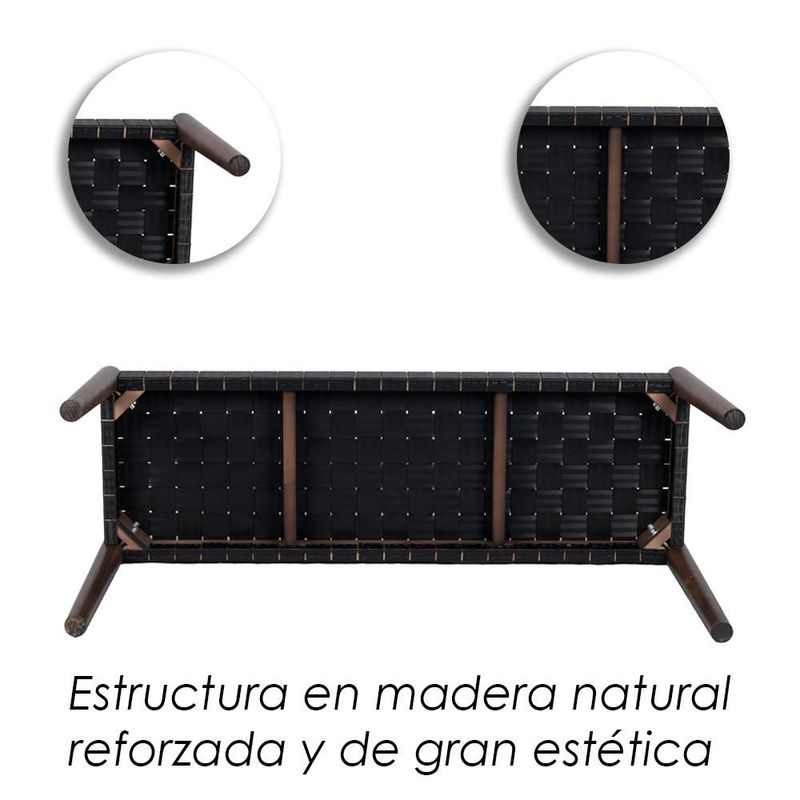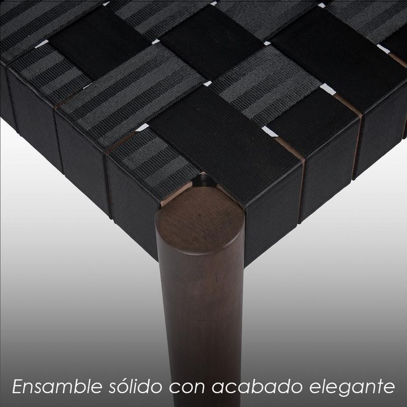 Ilios Innova | Banca Dun de madera con asiento entretejido de nylon negro, diseño moderno y elegante para interiores, terrazas y recibidores.