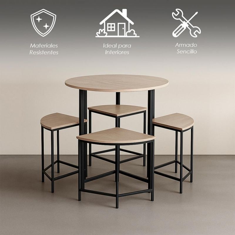 Ilios Innova | Juego de Comedor Industrial con Sillas Acoplables y Mesa Redonda. Estilo Moderno para 4 Personas, Base Metálica y Cubierta de MDF.