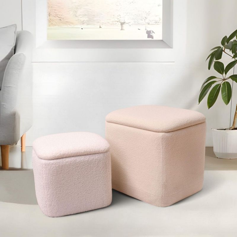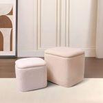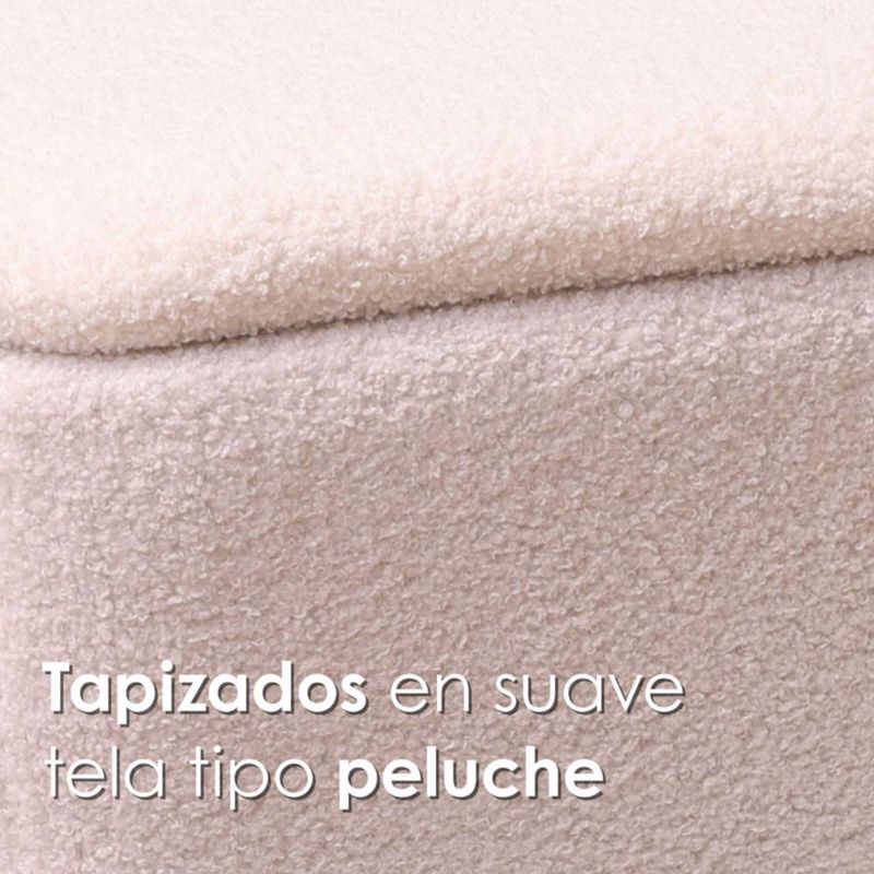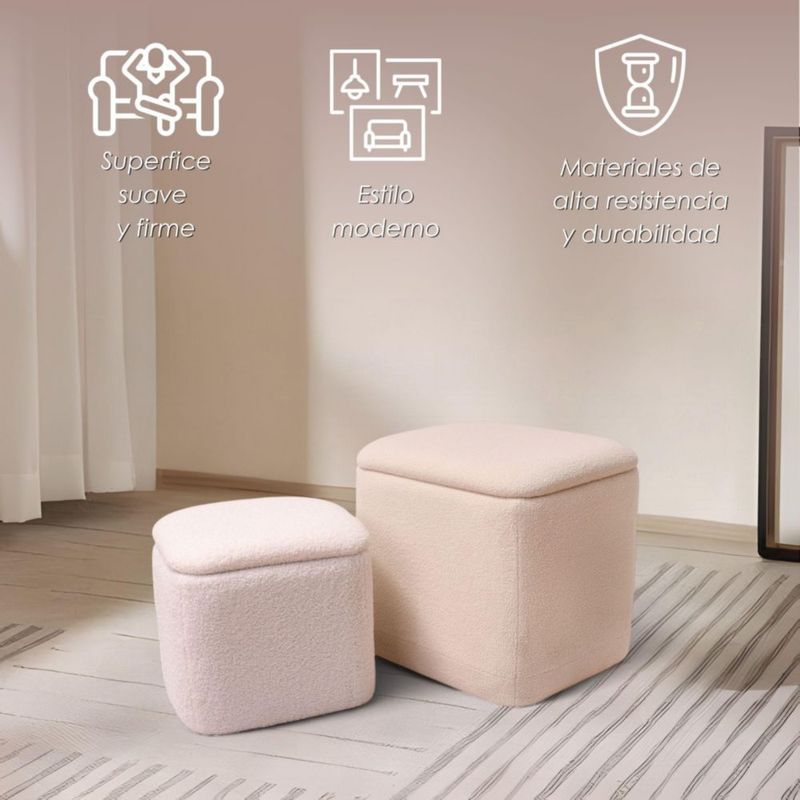 Ilios Innova | Set 2 Taburetes Beige con Almacenamiento Oculto, Acolchado en Tela Peluche, Apilables uno Dentro del Otro. Ideal para Sala o Recámara