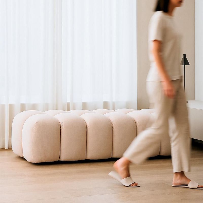 MueblesSalaPuffs y TaburetesIlios Innova | Taburete Tofu Beige tapizado en tela de canna con diseño minimalista, asiento acolchado. Ideal para sala, recámara o recibidor.
