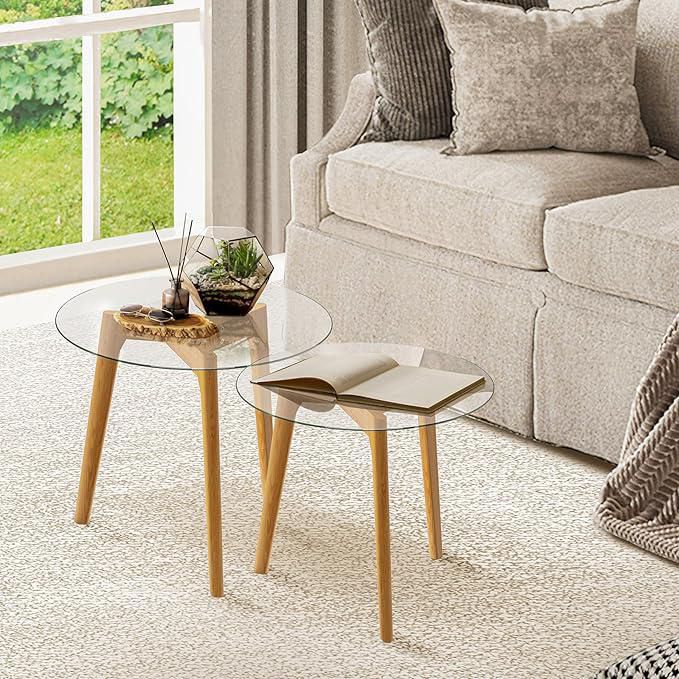 MueblesSalaMesas auxiliaresJuego de 2 mesas auxiliares de cristal minimalistas con base de madera