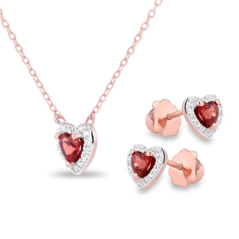 JUEGO DE GARGANTILLA Y BROQUELES DE CORAZON ORO ROSA 14K CON GRANATE Y 9PTS DE DIAMANTE
