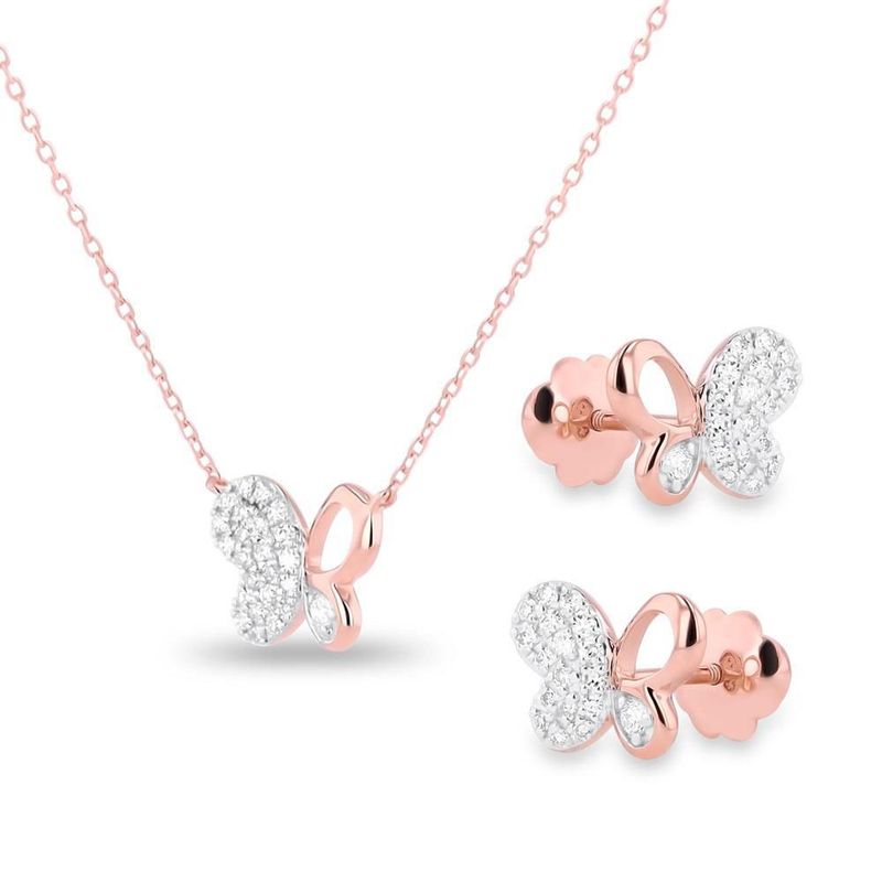 Moda y accesoriosJoyeríaSetsJUEGO DE GARGANTILLA Y BROQUELES DE MARIPOSA ORO ROSA 14K CON 17PTS DE DIAMANTE