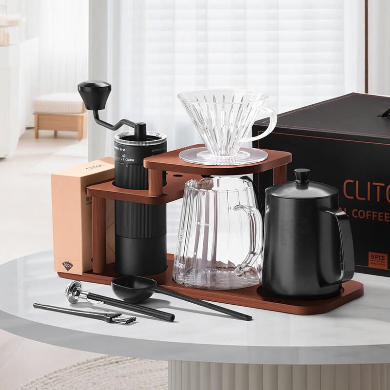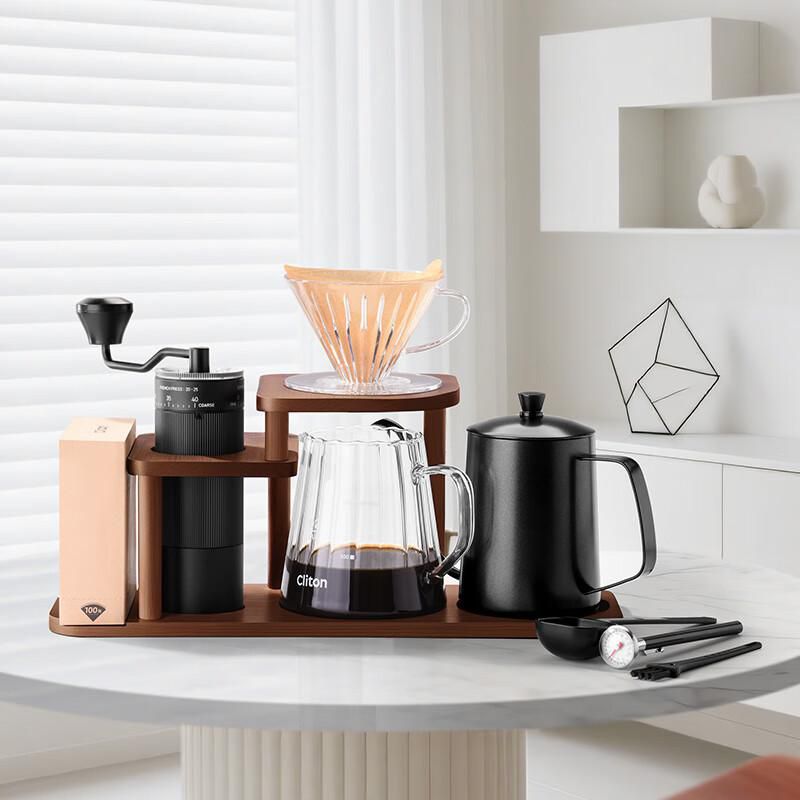Línea blancaElectrodomésticosCafeteras y TeterasJuego para café de goteo Cliton 10 piezas con molino manual y soporte de madera