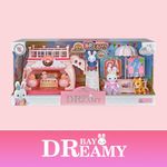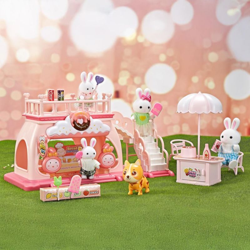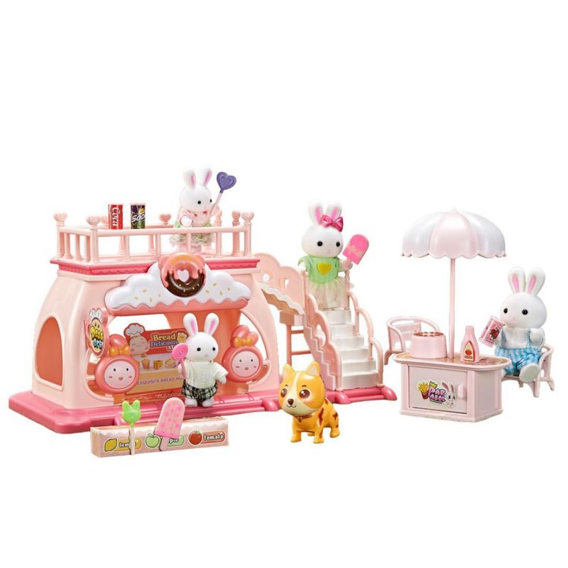 Juguete Casa de Muñecas Set Tienda de Postres de Conejitos con Terraza, Resbaladilla, Accesorios y Figuras Incluidas
