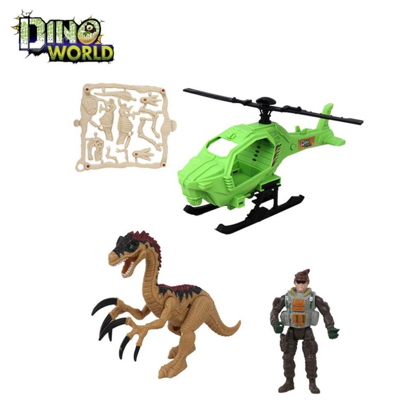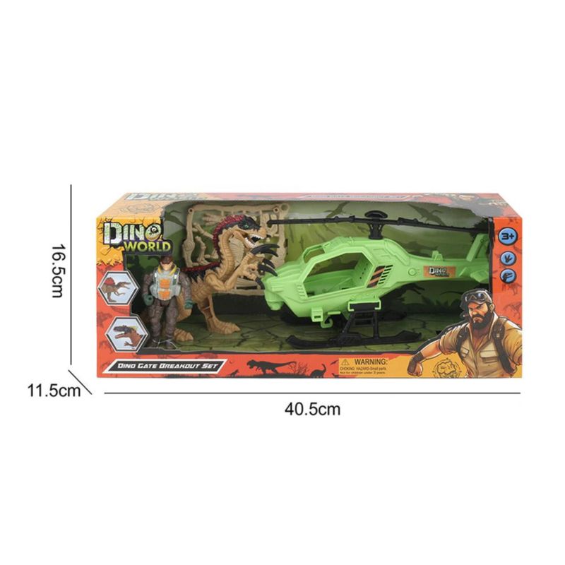 Juguete Set Dino World con Helicóptero Militar, Dinosaurio, Figura de Explorador y Accesorios Incluidos