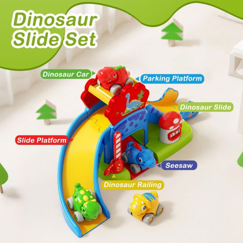 Bebés y juguetesJuguetesFiguras de AcciónJuguetes para bebés de 1 año, regalo para niños y niñas: juego de tobogán de dinosaurios con 4 coches de empuje de colores y núm