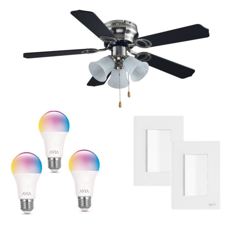 Kit ventilador funcional café 3 velocidades 5 aspas 2 placas apagador linea cristal 3 modulos negros y 3 focos inteligentes led de regalo