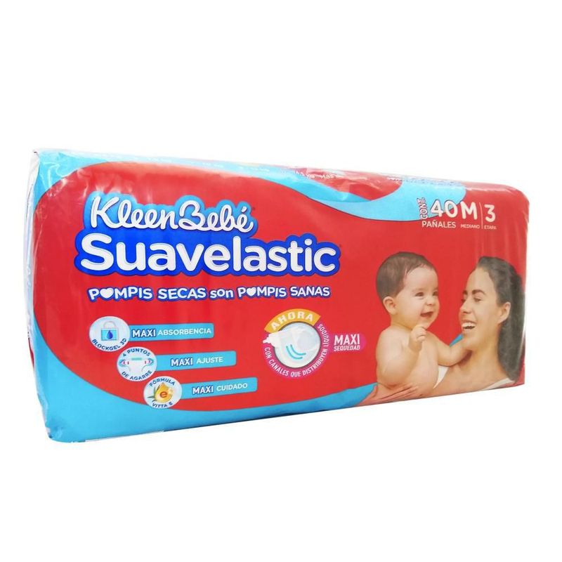 Salud y Equipamiento MédicoFarmaciaPañales e IncontinenciaKLEEN BEBE SUAVELASTIC MAX MED E3 PAÑALES MEDIANO Paquete