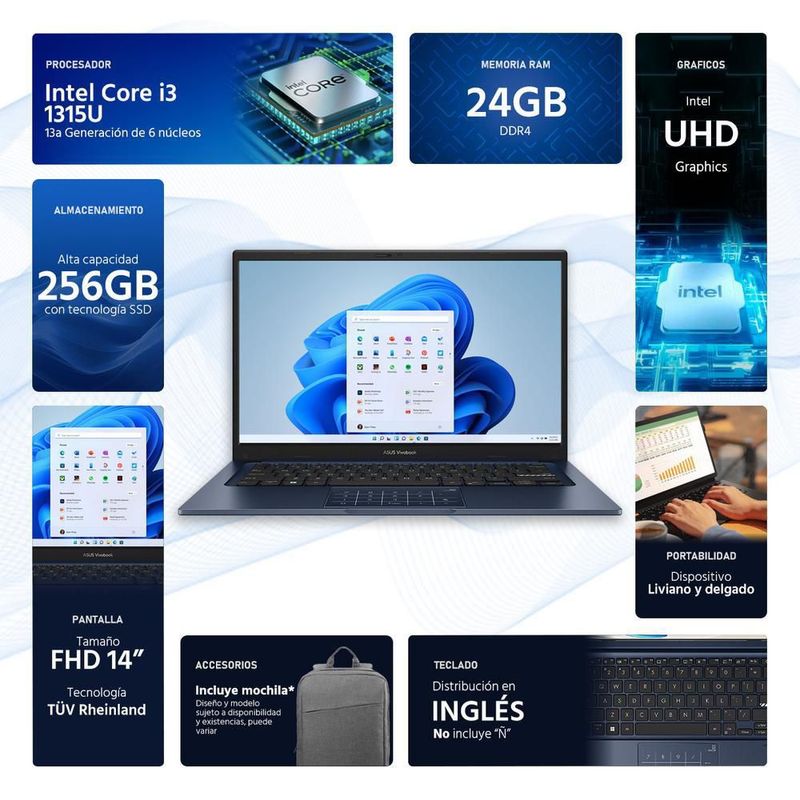 CómputoPortátilesLaptopsLaptop asus vivobook 14 core i3 24gb ssd 256gb 14 mochila