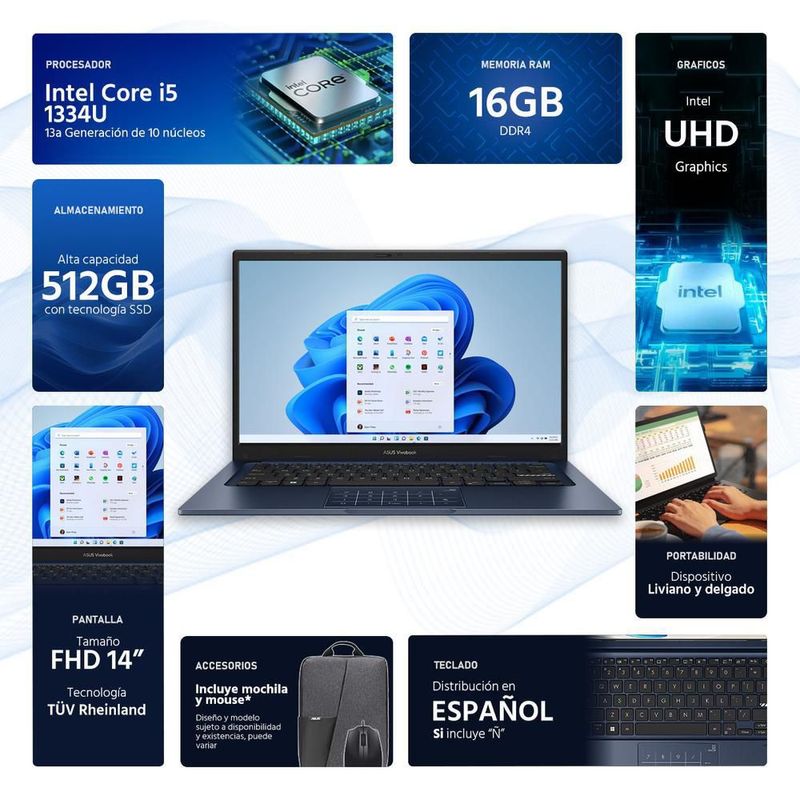 CómputoPortátilesLaptopsLaptop asus vivobook core i5 1334u 16gb 512gb mouse mochila